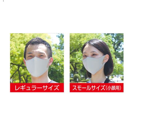 写真の男性モデルが着用しているものがレギュラーサイズ、女性モデルが着用しているものがスモールサイズ(小顔用)です。